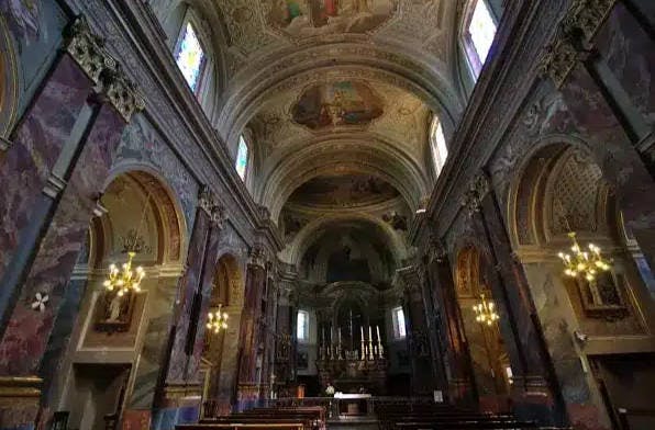 Das Innere der Kirche, mit einem einzigen Kirchenschiff und 6 seitigen Kapellen, ist im piemontesischen Barockstil mit Stuck und Rundbogen.